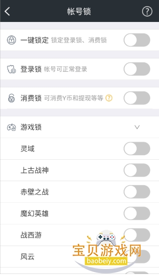 3、点击【账号锁】功能,你可以根据需求开启登录锁、消费锁、游戏锁等多种账号保护措施;