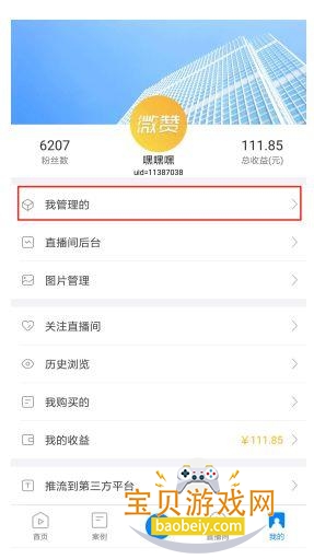 2、进入管理页面。选择管理栏,进入管理的直播间;