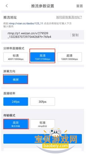 2、选择好合适的参数,进入直播界面,参数越大,需要的网络带宽和手机性能越高,建议使用高清模式即可。