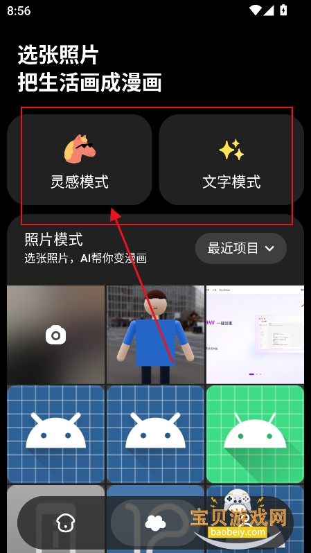 3、进入生成界面,可以选择灵感模式,或者文字模式,以及照片模式