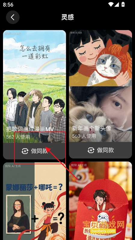4、例如进入【灵感模式】可以根据素材模板,选择喜欢的模板,点击生成同款