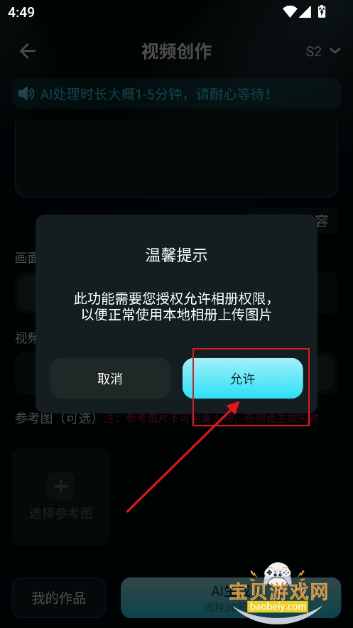 3、然后滑屏到下方上传参考图,点击【允许】