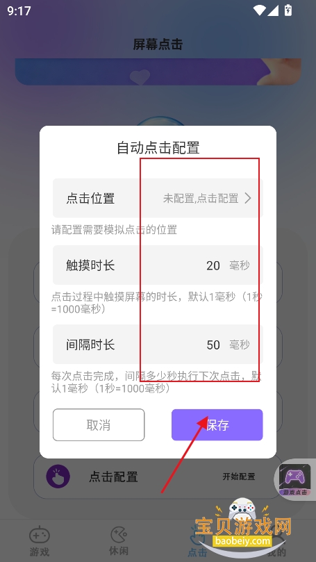 5、最后进入【自动点击器配置】输入相关参数,点击保存