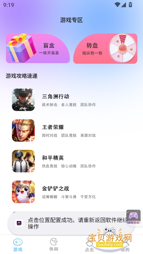答:它是一款专为手游玩家打造的全能游戏辅助APP,集自动连点器、游戏中心、盲盒转盘、游戏攻略于一体,一站式满足玩家游戏相关需求。