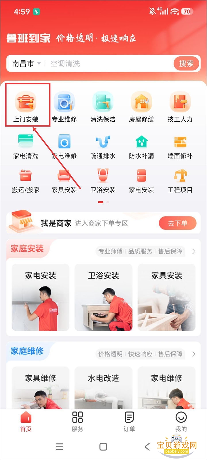 1、打开鲁班到家app,在首页选择你需要的服务,这里点击上门安装;