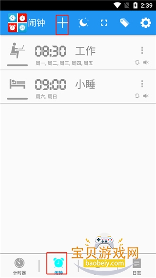 2、点击闹钟,点击+号;