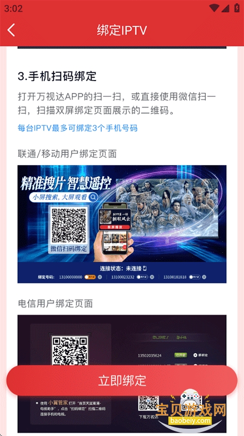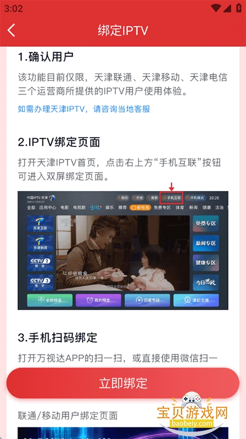 5、阅读完绑定IPTV流程后点击下方立即绑定试试吧