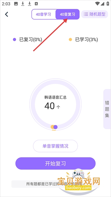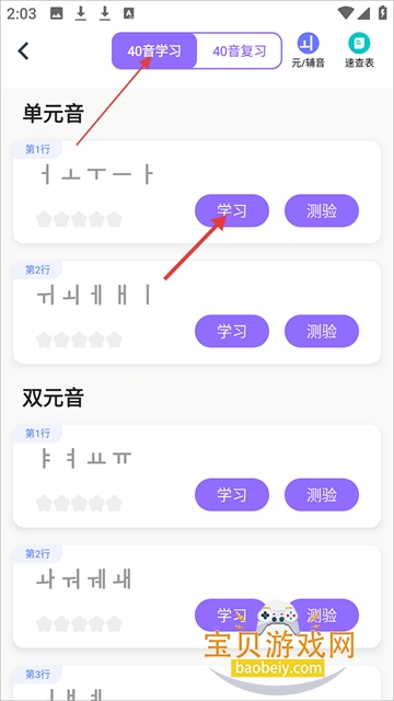 5、点击40音复习,你可以在这复习学习的韩语。
