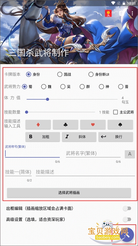 1、打开工具,选择卡牌版本、武将势力,设置体力值和数量,输入武将称号、名字以及技能描述等,下面选择武将插画,最后点击右下角的图标。