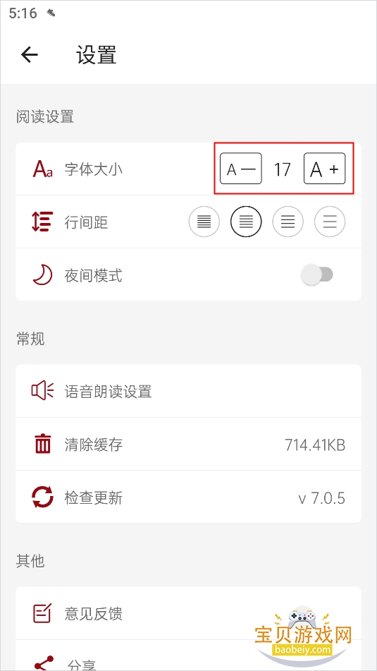 3、进入到设置页面,点击字体大小右侧的A-、A+按钮即可调整字体大小