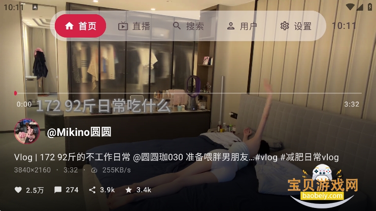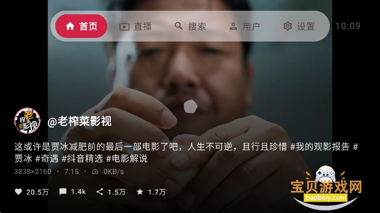 内容交互:短按确定键显示/隐藏视频详情,长按进入创作者主页,支持点赞、收藏等基础互动。