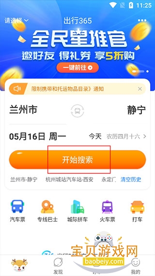 2、登陆后,在首页查询框中输入起始点和出发日期,点击开始搜索。