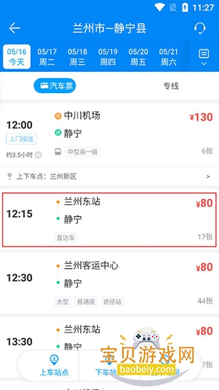 3、页面跳转到线路时刻表,乘客可选择合适的时间,单击一下即可看到线路详情,包括途经站、距离、当前售票状态等。点击一下,即可进入购票订单。