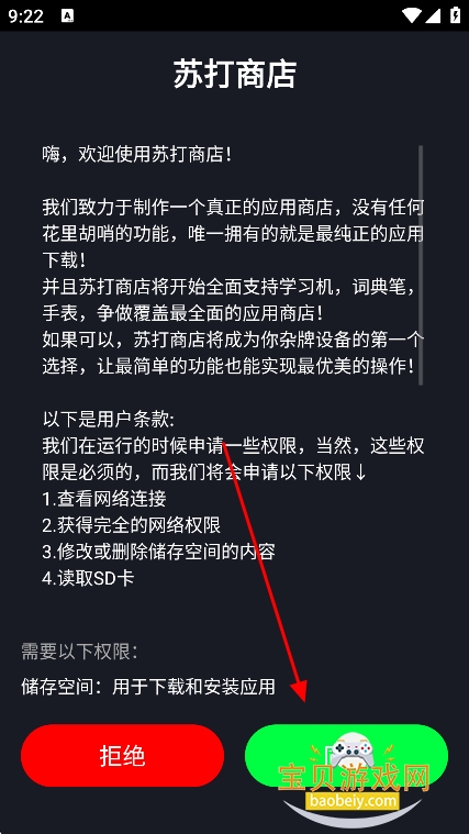 1、在宝贝游戏网下载安装苏打商店app安卓版,首次使用需要点击【同意】进入