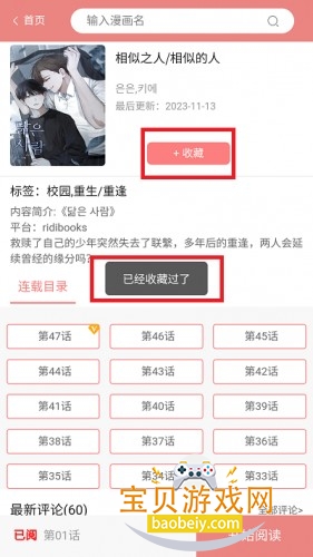 7、找到漫画之后进入到漫画的详情界面,点击上方的【收藏】就可以正常的收藏漫画留着以后欣赏了。