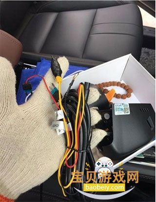 行车仪的配件部分,这里面接口部分一共有5个:黑色圆圆的插针式接口,接行车仪主机;粗色的黄线,AV接口(没什么用的);细点的黄线接,接常电保险;细点的红色接线,接ACC保险;细点的黑色接头,是接地线的,打铁即可。