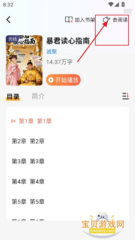 1、进入喜欢的小说界面,点击右上角【去阅读】