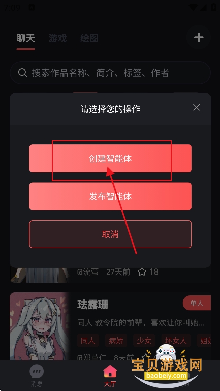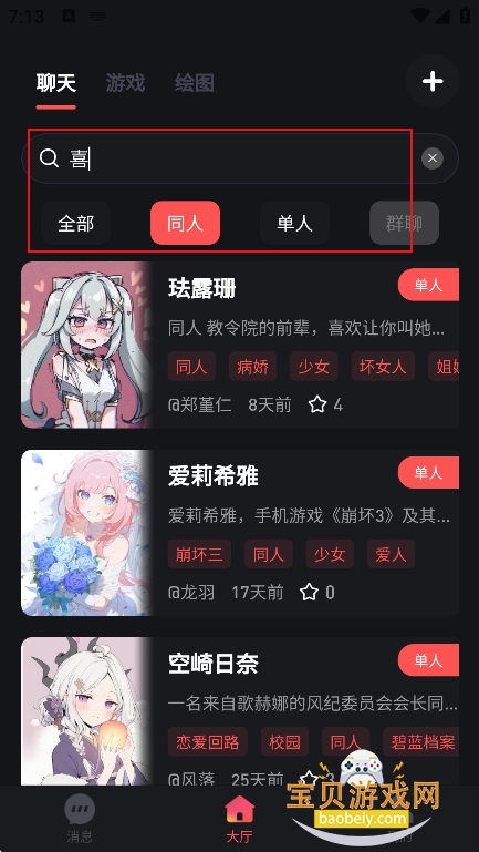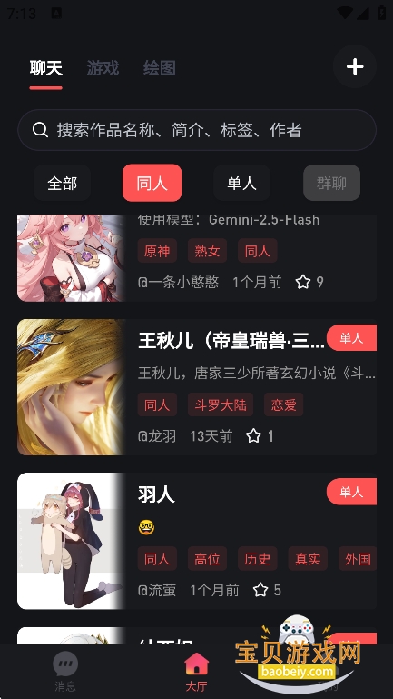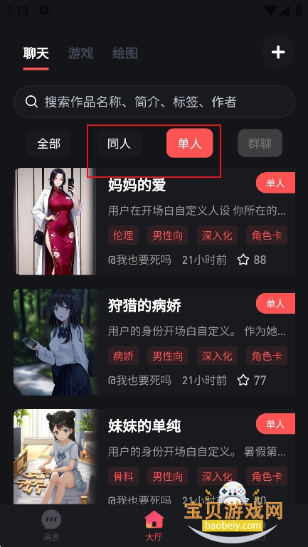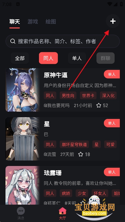1、进入【大厅】板块,查看全部角色,或者查看同人,以及单人角色