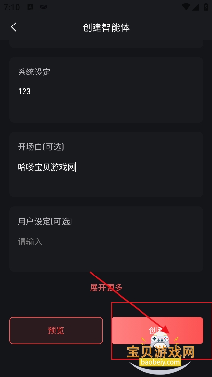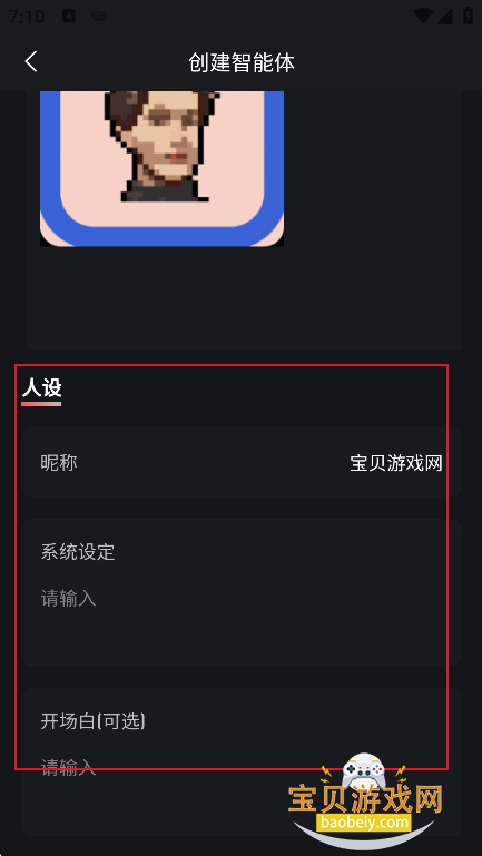 4、然后在【人设】界面,输入昵称,开场白,系统设定等