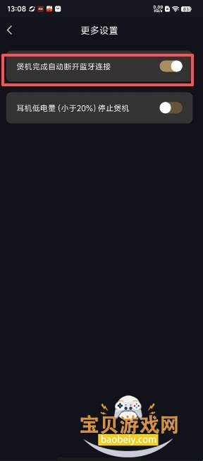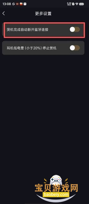 2、第二步:点击“更多设置”,找到页面上的“煲机完成自动断开蓝牙连接”后面的白色圆形滑块