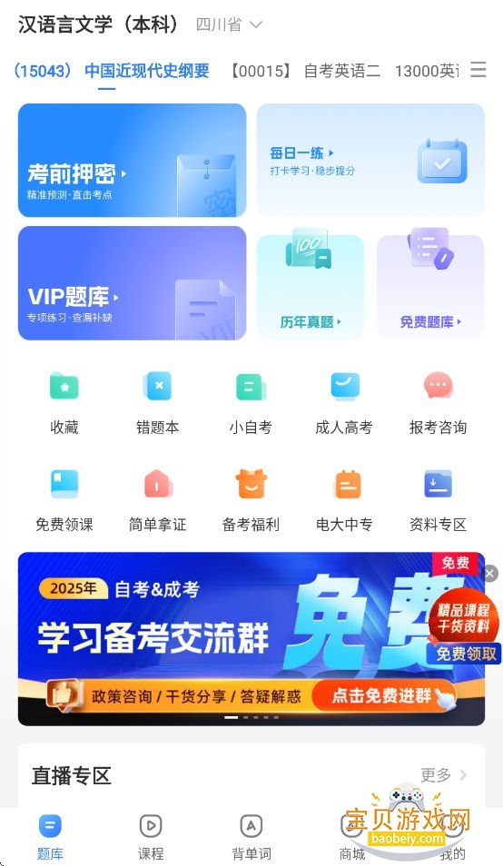 用户可以在此界面查询各种科目的题库、预约学习直播、自考资讯,各种考试查询和备考技巧等等功能。界面上方可以更改省份,选择不同的考试内容以及专业。