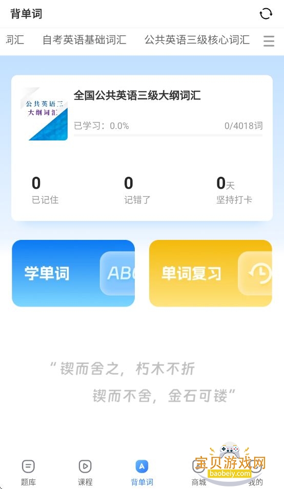 页面上方可以选择不同考试类型的单词内容,用公共英语三级、学位英语、英语四级、自考英语等。