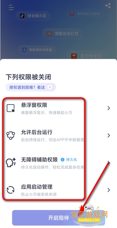 2、然后开启所有权限,继续点击【开启陪伴】