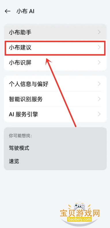 进入小布助手设置后,选择“小布建议”功能。