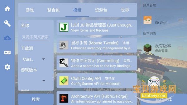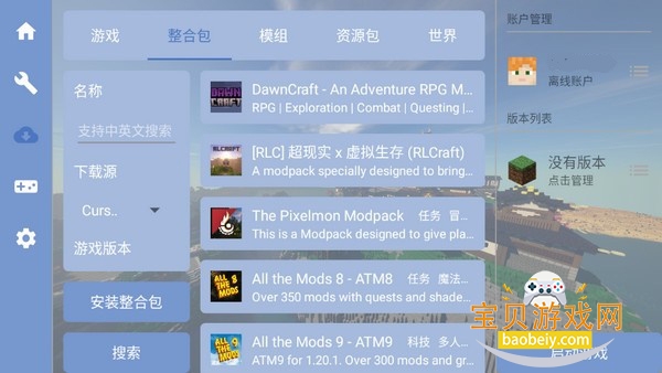 1、在启动器中点击整合包栏目可以看到详细的整合包资源;选择模组可以任意下载模组,这里支持中文英文搜索,可以按下载源,游戏版本,类型等等进行挑选