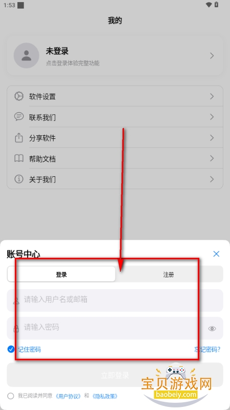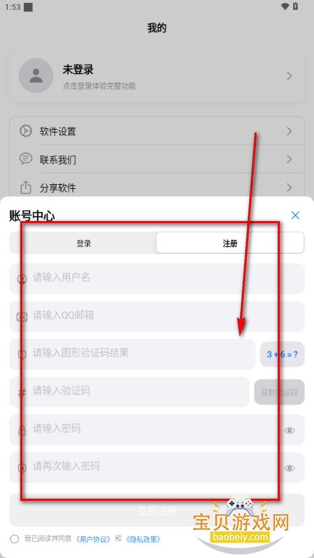 3、新用户直接切换到【注册】界面,输入基本信息,点击注册即可
