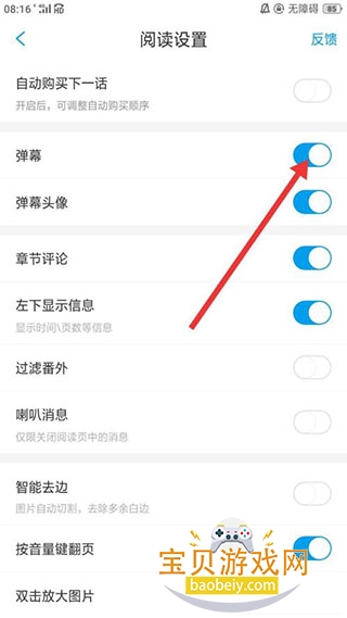 4、进入到阅读设置界面后,我们再滑动弹幕后面的滑块至灰色即可。