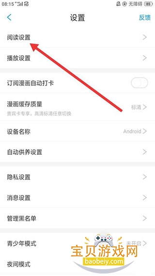 3、进入到设置界面后,我们再点击上面的阅读设置选项即可。