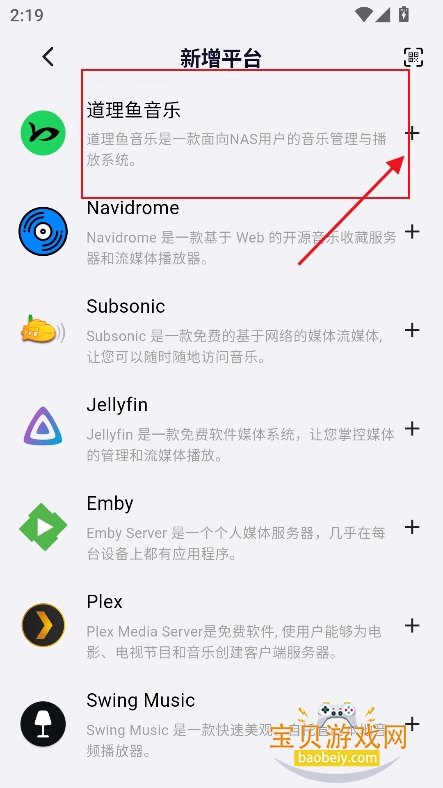 2、选中道鲤鱼音乐平台,点击右侧+号