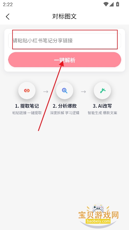 2、例如进入【对标图文】在文本框输入原笔记地址,点击一键解析,就可以提取笔记,完成爆款分析