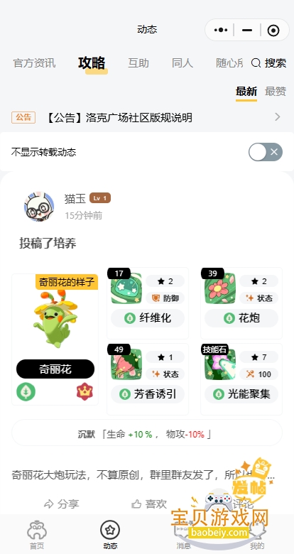玩家可发布/浏览开荒心得、配队方案、抓宠技巧、任务攻略,支持评论、点赞、收藏,社区活跃度高。