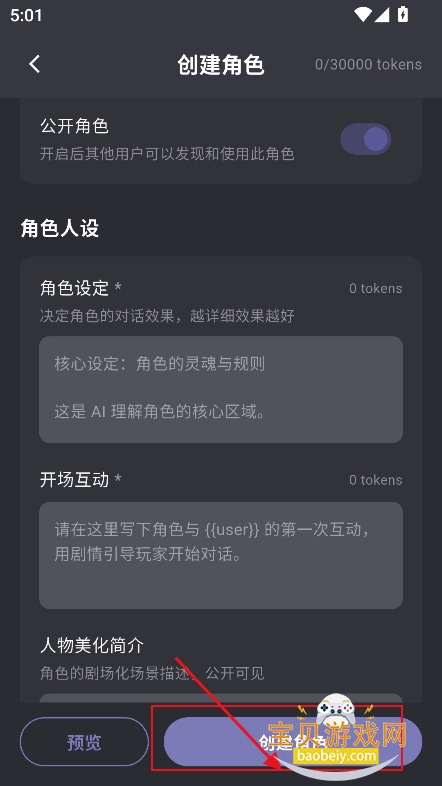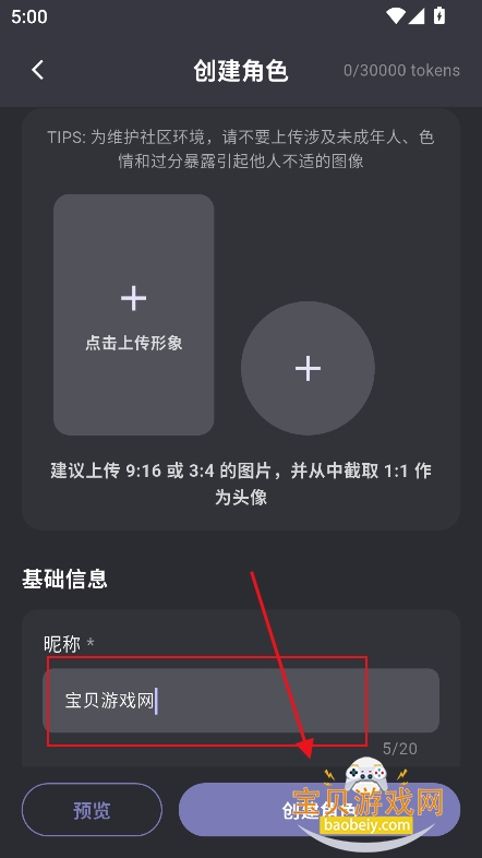 2、在创建角色界面,上传头像,背景图,输入昵称