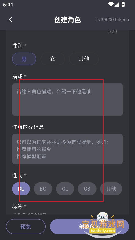3、然后输入性别,角色背景,人设,等参数
