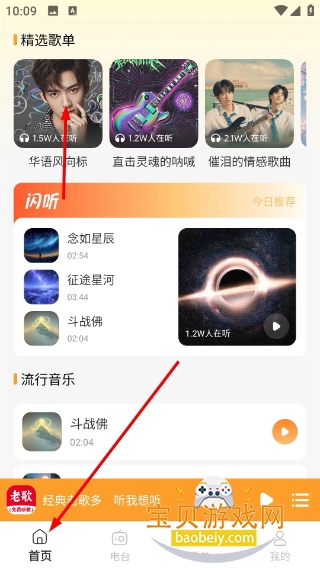 1、首页可浏览精选歌单与闪听内容,点击目标歌曲就能直接播放收听。