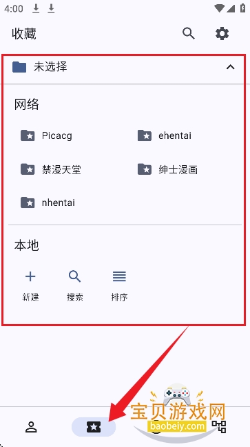 3、收藏界面中可以选择漫画平台和来源,可以从本地导入。