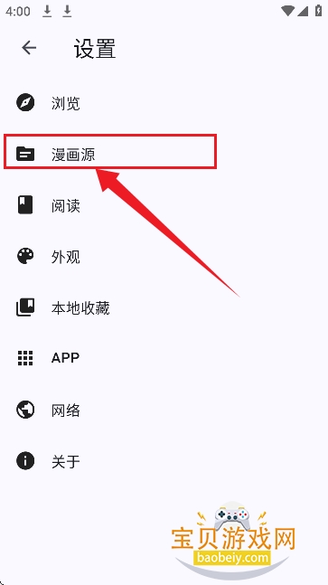 找到并点击“漫画源”选项。