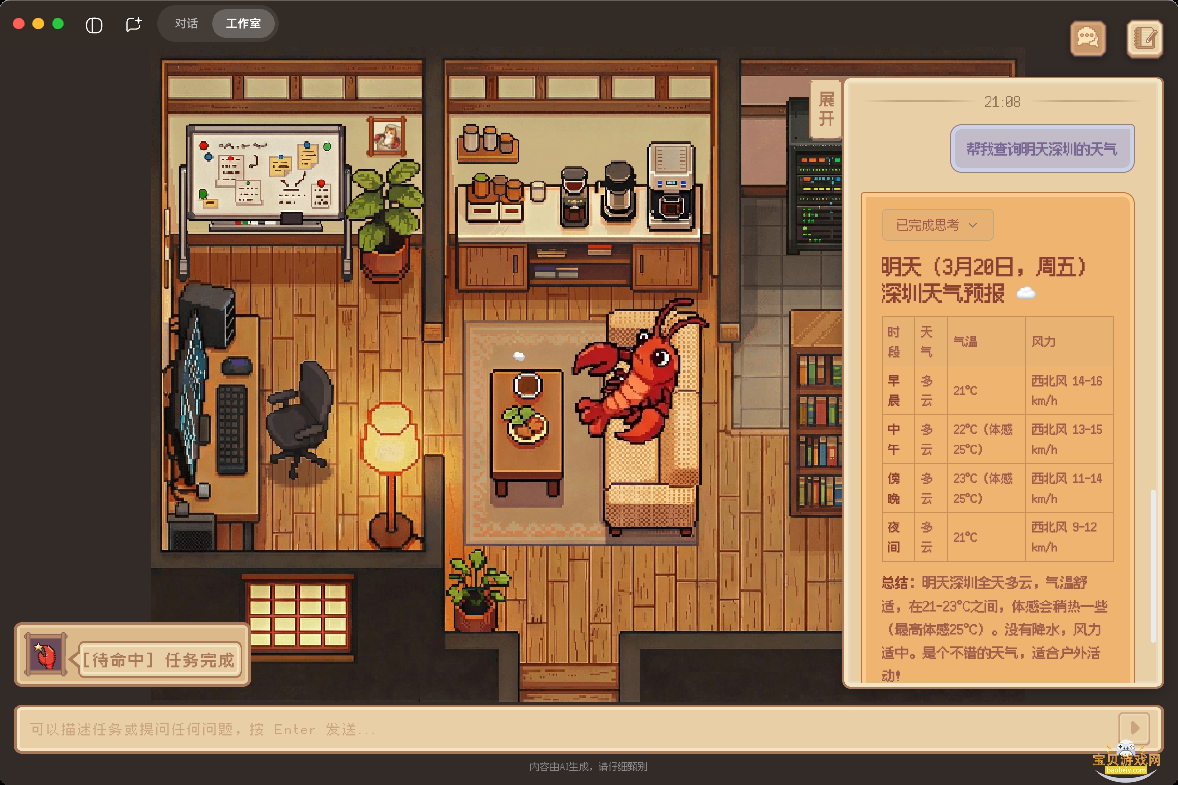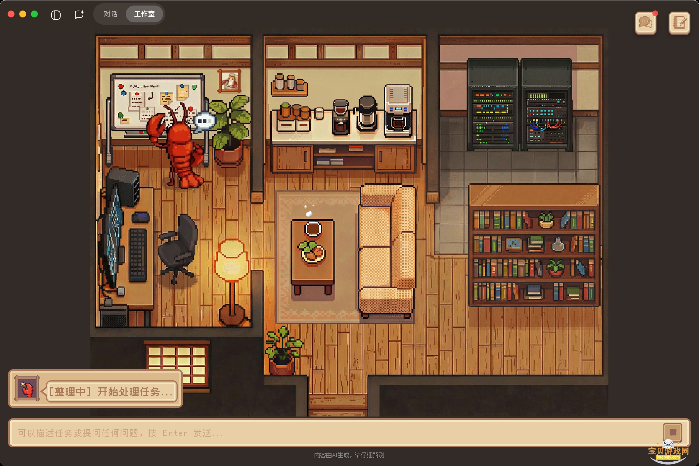 我们为龙虾打造了一间像素风格的专属工作室。它不再只是后台的一个进程,而是会根据工作状态忙前忙后的“像素打工人”。