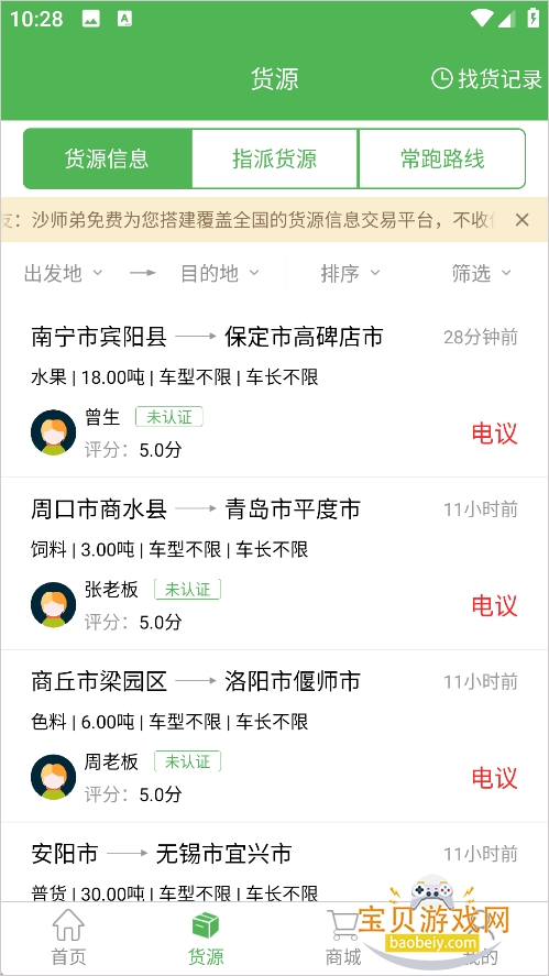 2、如果想查看更多货源信息,可以到【货源】页面进行浏览,点击具体货源后可以联系货主来提交报价。