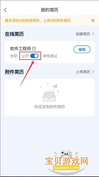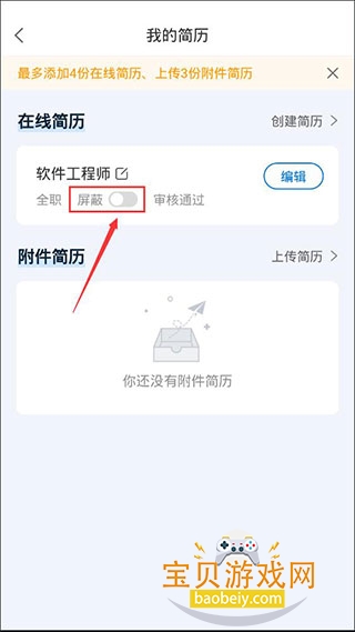 3、然后点击简历卡片上的【开关】按钮,即可将公开状态切换为屏蔽状态。