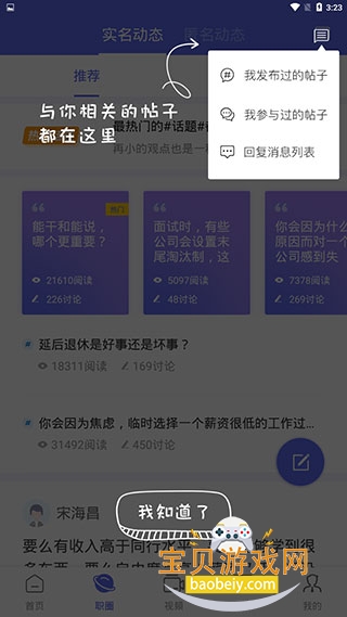 2、【职圈】:这里就相当于是一个小型的社区交流论坛,当然都是关于职场和工作方面的内容,右上角还可以查看与我相关的内容。