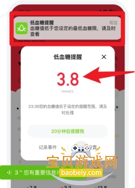 4、当血糖值异常时系统将自动弹出提醒窗口,并支持延后提醒与事件记录操作。