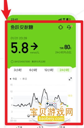 2、登录后进入首页可查看当前血糖值与波动趋势图,支持切换不同时间段分析。