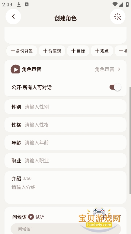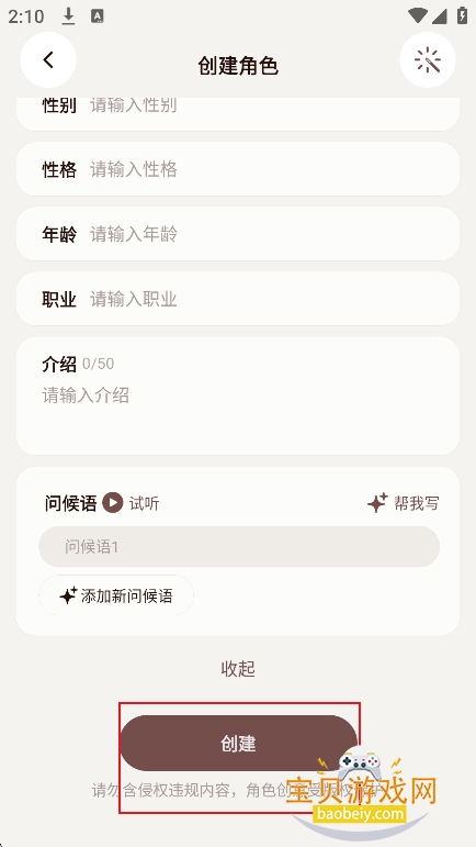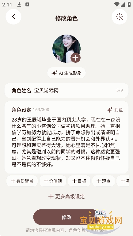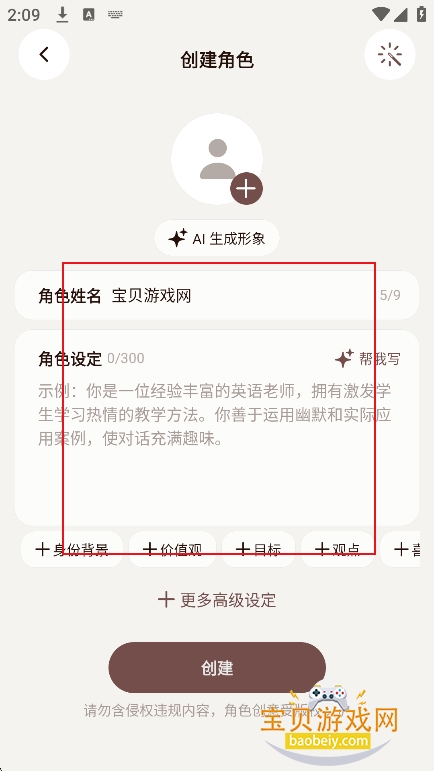 3、给你创建的角色输入昵称,上传头像,以及角色设定等
