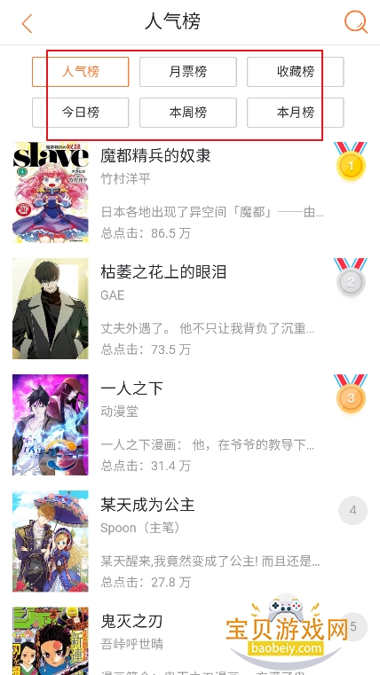 2、进入【排行】还可以根据人气榜单,筛选优质的漫画内容