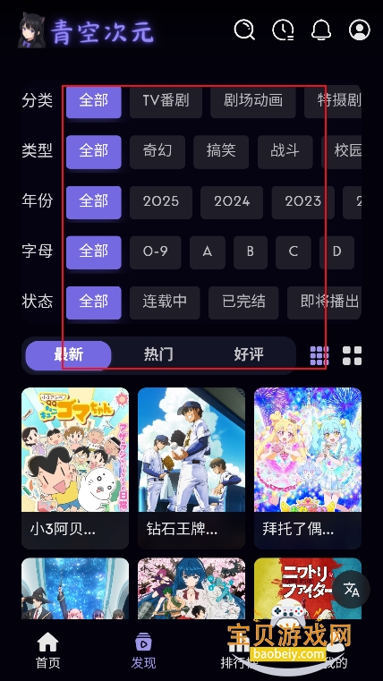 青空次元app官方正版免费版,是专注动漫追番的在线观影平台,以更新快、资源全、分类细、体验纯为核心优势,满足二次元爱好者日常追番、补番需求。平台界面简洁清爽,操作便捷易上手,专注打造舒适纯粹的看番环境,无论是新番追更还是经典回顾都能轻松实现。平台实时同步海内外新番连载,热门剧集、剧场版、经典老番全覆盖,更新频率高,喜欢的用户可以直接宝贝游戏网下载体验吧!