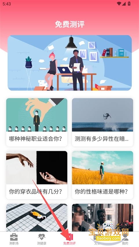 1、点击底部导航栏"免费测评",进入免费测评页面;